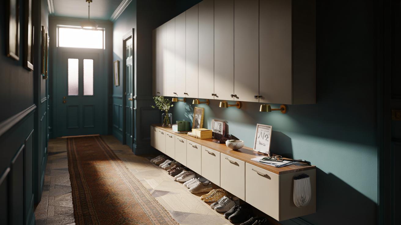 Upgrade options transform function. Lay a 20 cm-deep oak or birch strip along the top for a warm console effect; a dab of grab adhesive and discreet brackets will do. Add a cable grommet in one unit to create a minimalist charging station: stash a power strip inside, route leads through, and your surfaces stay wire-free. Inside, stick-on hooks corral keys; narrow baskets stand upright to divide mail and paperwork. For renters, use the fewest holes: mount two cabinets where studs or solid masonry exist, then bridge with a wood top to span wider. Remember load discipline — trainers and letters, yes; barbell plates, no.