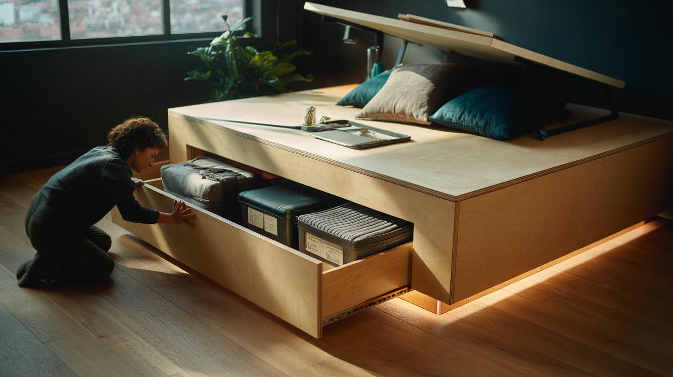 Imagine carving a void from thin air. A raised platform floor—200 to 450 mm high—creates concealed volume without nibbling into walls. Under the surface sit underfloor drawers, crate bays, or lift-up hatches, perfect for luggage, seasonal clothes, sports gear, even a folding guest mattress. On top, the platform functions as a daybed, lounge zone, or desk perch. Done right, it looks intentional, like stepped architecture. A platform can effectively double your accessible storage without increasing the footprint.